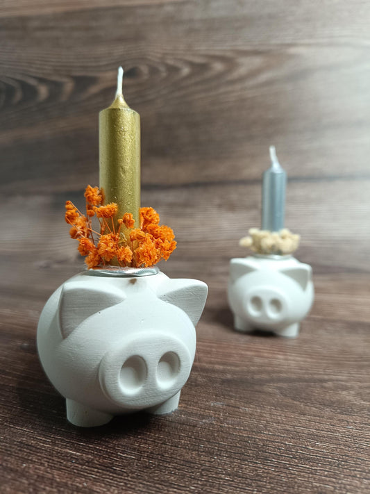 Glücksschwein aus Reliefgips mit goldener oder silberner Kerze – Handgemachtes Mitbringsel mit Trockenblumen, personalisiertes Geschenk
