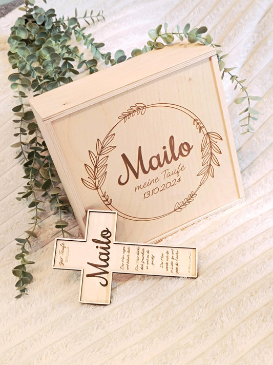 Personalisierte Holzkiste & Kreuz mit Gravur – Individuelle Taufgeschenke, Erinnerungskiste, Holzkreuz Taufe, Geschenk Baby Taufe, Taufpate