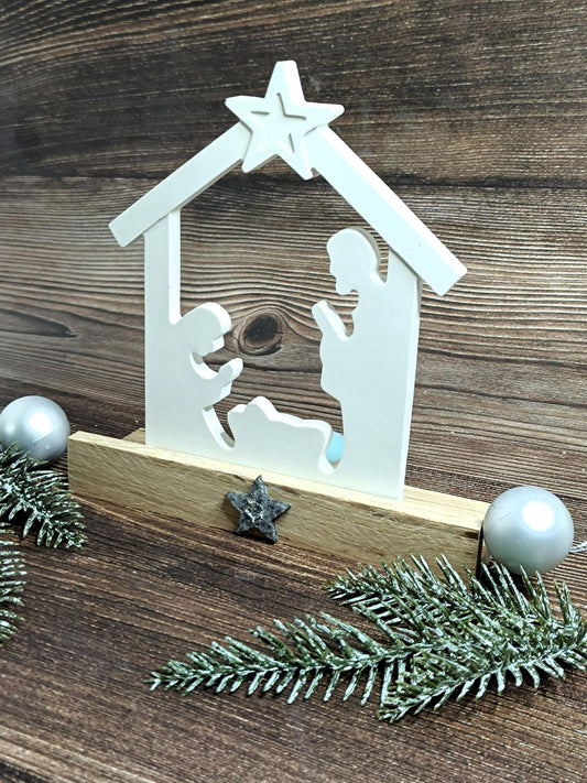 Mini-Krippe aus Reliefgips mit Holzständer – Platz für Teelicht, für stimmungsvolle Atmosphäre, personalisierbar mit Gravur, Weihnachtsdeko