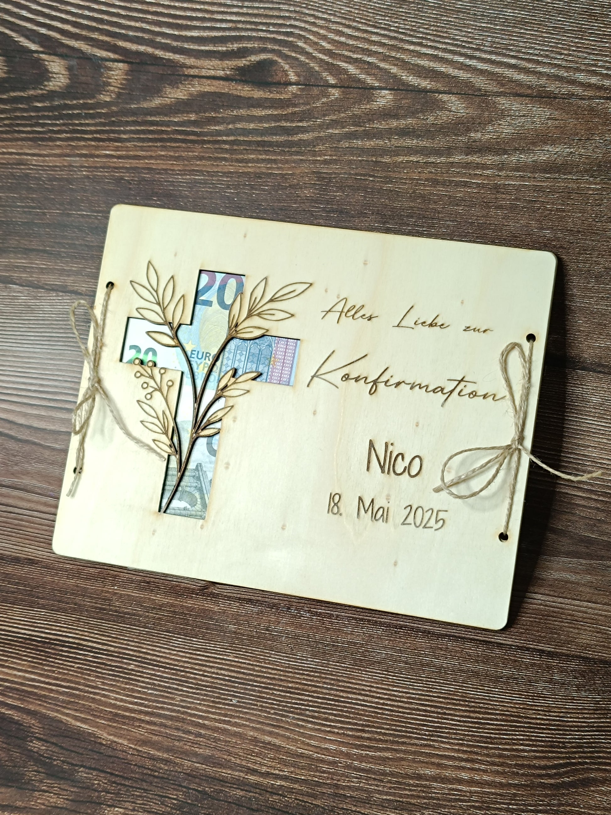 Diese liebevoll gestaltete Holztafel mit Gravur ist nicht nur ein stilvolles Geldgeschenk, sondern auch eine bleibende Erinnerung an einen besonderen Tag.